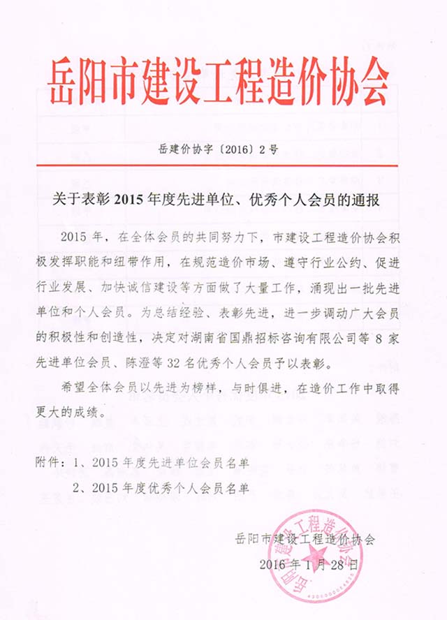 2015年岳陽市造價協(xié)會先進會員單位與先進個人
